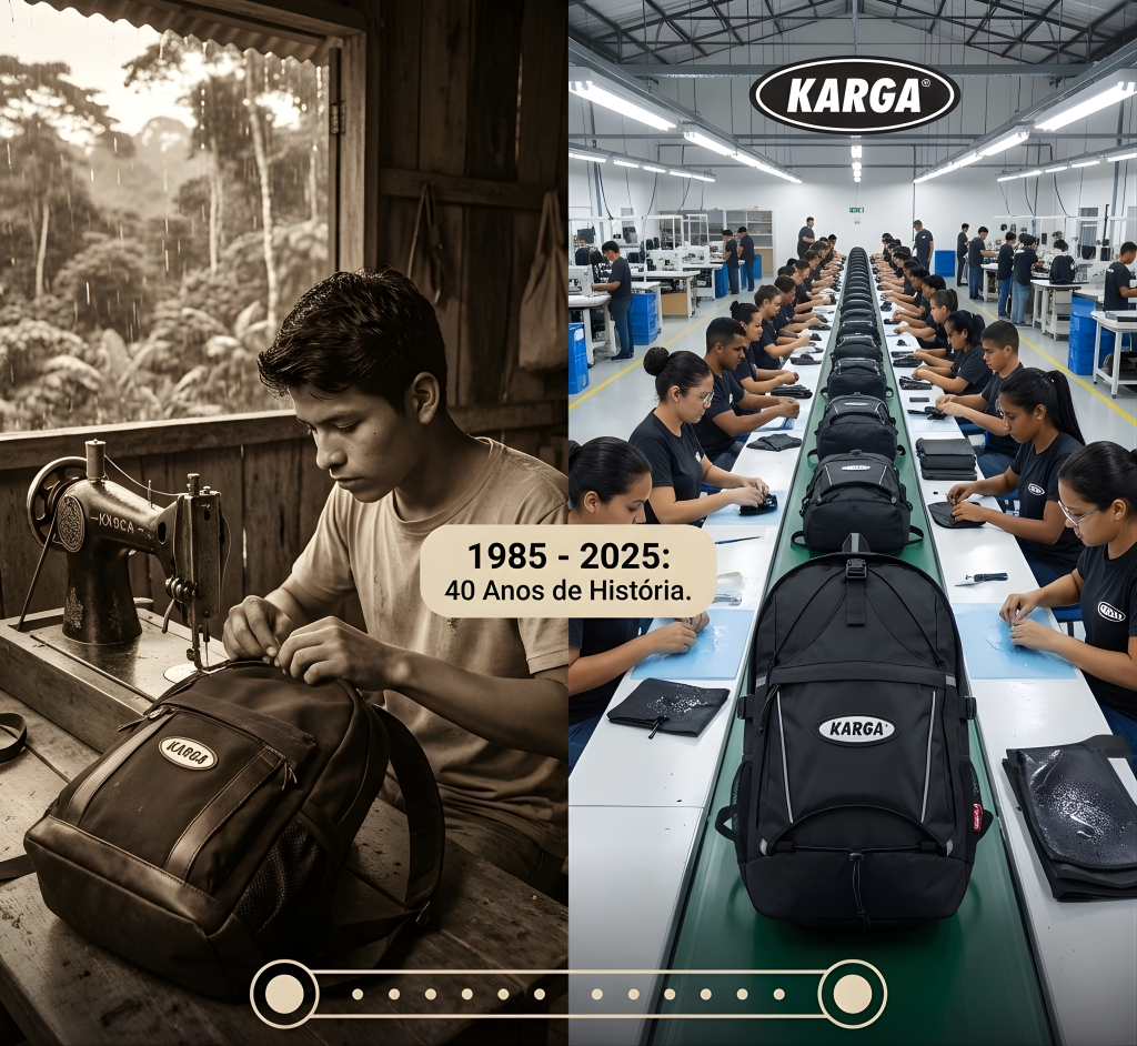 Em 1985, Achilles Prado tinha 18 anos e um projeto:reconstruir sua mochila com compartimentos inovadores.40 anos depois, Karga é a maior empresa brasileira especializada em mochilas, produzindo mais de 400 mil peças por ano, com presença em 5 países. Mas nossa missão nunca mudou: criar mochilas que DURAM, que PROTEGEM, que RESISTEM ao clima amazônico e que conectam você às suas raízes.